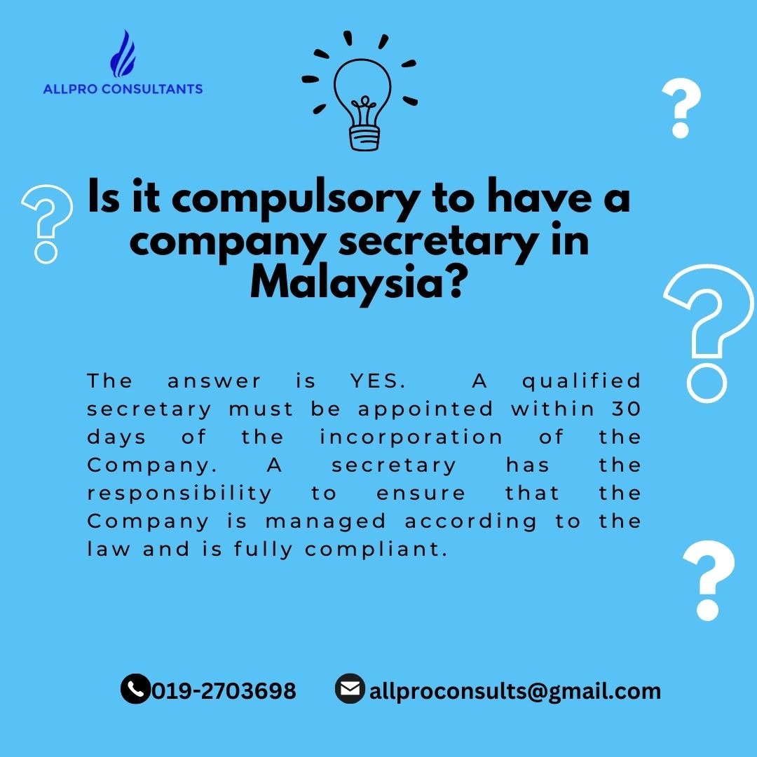 In conclusion, all companies in Malaysia are required to appoint a Company Secretary, to carry out the various functions related to the running of a Company and to ensure compliance with the Companies Act and related bye-laws.